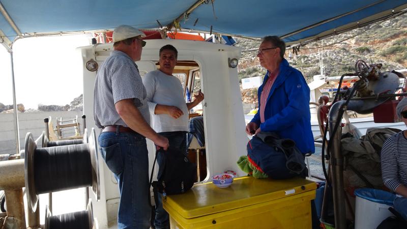 Nach dem lockeren Strandaufenthalt ging es mit dem Boot zurück in den Hafen, wo wir gemeinsam ein schmackhaftes Essen zubereiteten. Mit bester Laune und beschwingt vom schönen Tag holte der Bootsführer schon bald seine Mandoline heraus und spielte ein paar schöne Stücke typisch kretischer Musik – und wie fast immer konnte kaum jemand seine Füße dazu still halten: nach kurzer Zeit stand die gesamte Gruppe auf dem Steg und lernte die ersten Schritte der typisch kretischen Kreistänze – eine wunderbare Erfahrung für alle.